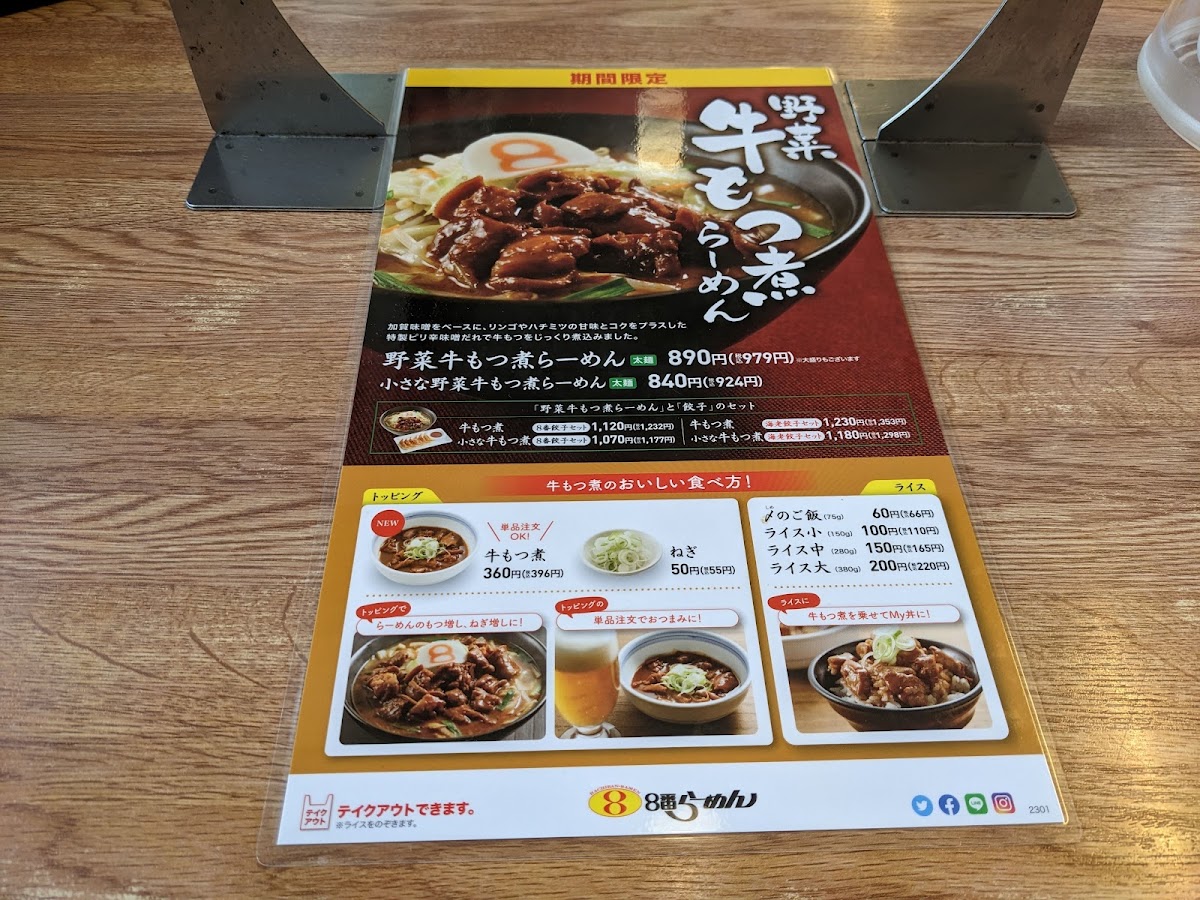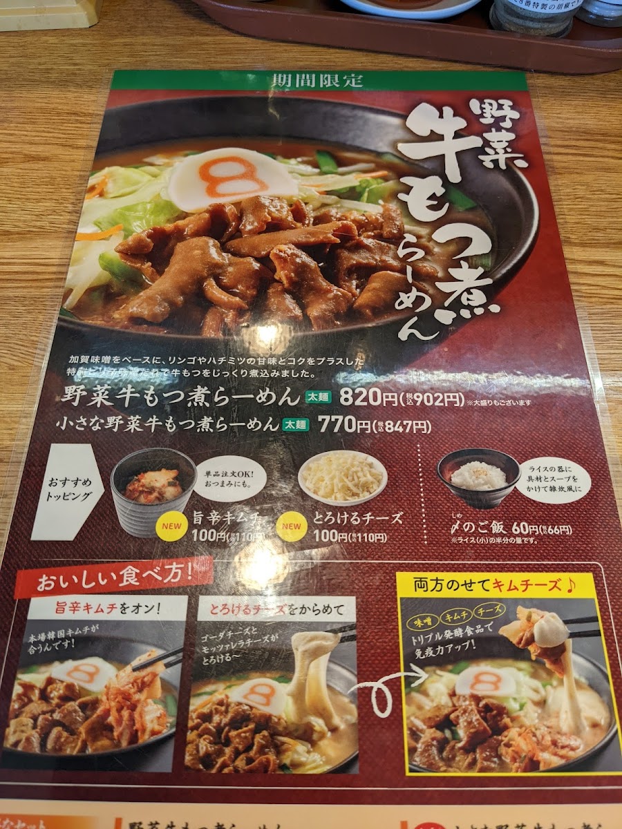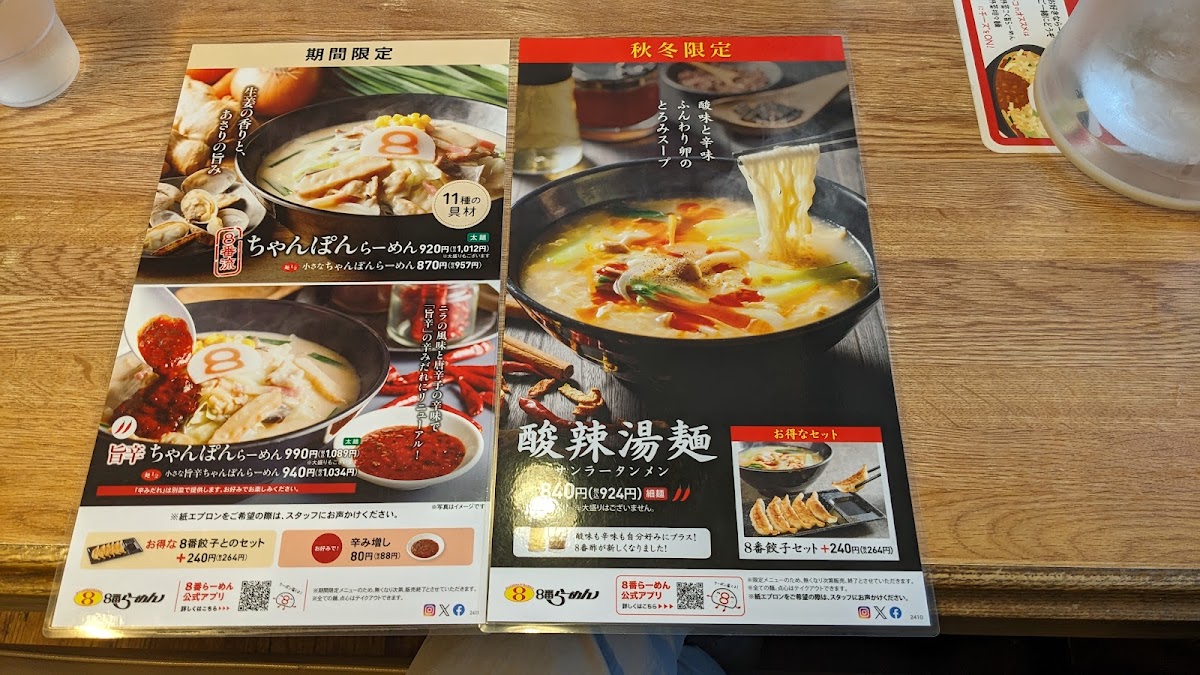 The menu at Hachiban Ramen Kashima offers an impressive variety of hearty and flavorful dishes, with something for everyone. Their ramen selection is extensive, featuring staples like the 唐麺, a bold and spicy choice, and the comforting しおらーめん&小チャーハン, which pairs a light and savory salt ramen with a small portion of fried rice. For those craving something richer, the bセットみそバター offers a creamy and satisfying miso-butter ramen, while the 野菜 らーめん味噌野菜増し provides a delightful veggie-packed miso ramen. If you're visiting during the limited-time offerings, the 野菜ゆず塩ラーメン 期間限定 is a refreshing and citrusy ramen experience. The 酸辣湯麺 delivers a perfect balance of sour and spicy flavors, while the とんこつ白湯ラーメン serves a rich and creamy tonkotsu broth for a fulfilling meal. Their side dishes are just as enticing, with crispy 8番餃子 and savory ぎょうざ that complement any meal. For something unique, try the 野菜牛モツ煮ラーメン, which combines tender beef tripe with vegetables in a savory broth. If you’re looking to cool down, the れいめん (cold ramen) and ざる ラーメン offer a refreshing twist. The 野菜ラーメン塩&海老餃子 pairs salt-based vegetable ramen with shrimp gyoza, a perfect balance of light and satisfying. Finally, don’t miss the mini 炒飯, a tasty fried rice dish that rounds off any meal. Whether you're in the mood for a classic ramen, a seasonal special, or a hearty side, Hachiban Ramen Kashima has a diverse and mouthwatering menu that promises to satisfy all tastes.